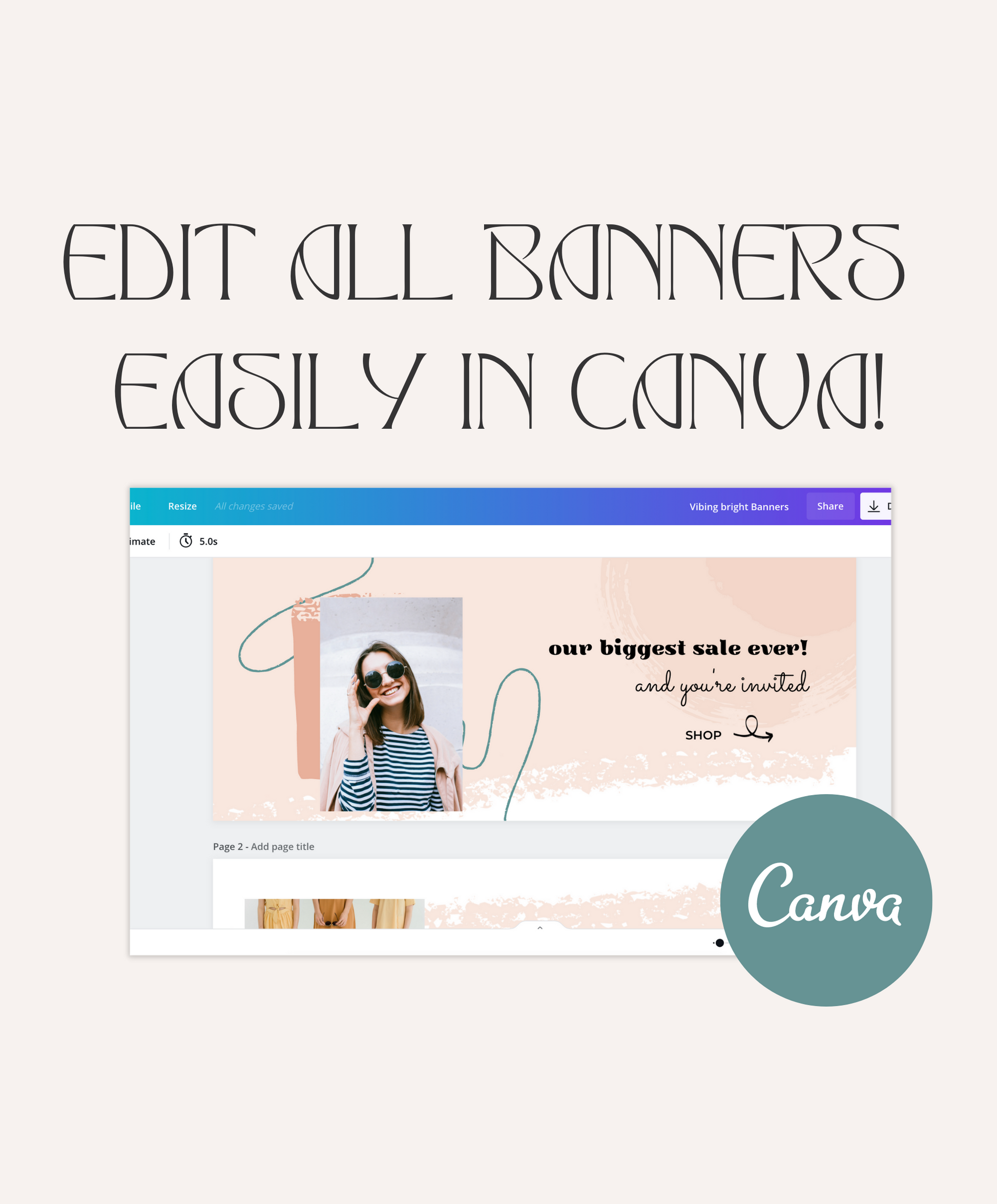 All Shopify store banners can be edited in Canva, and colors + fonts are editable in Shopify's customizer. Use Shopify's button feature or add text to your banners through design. Just swap out the images and colors to match your brand.