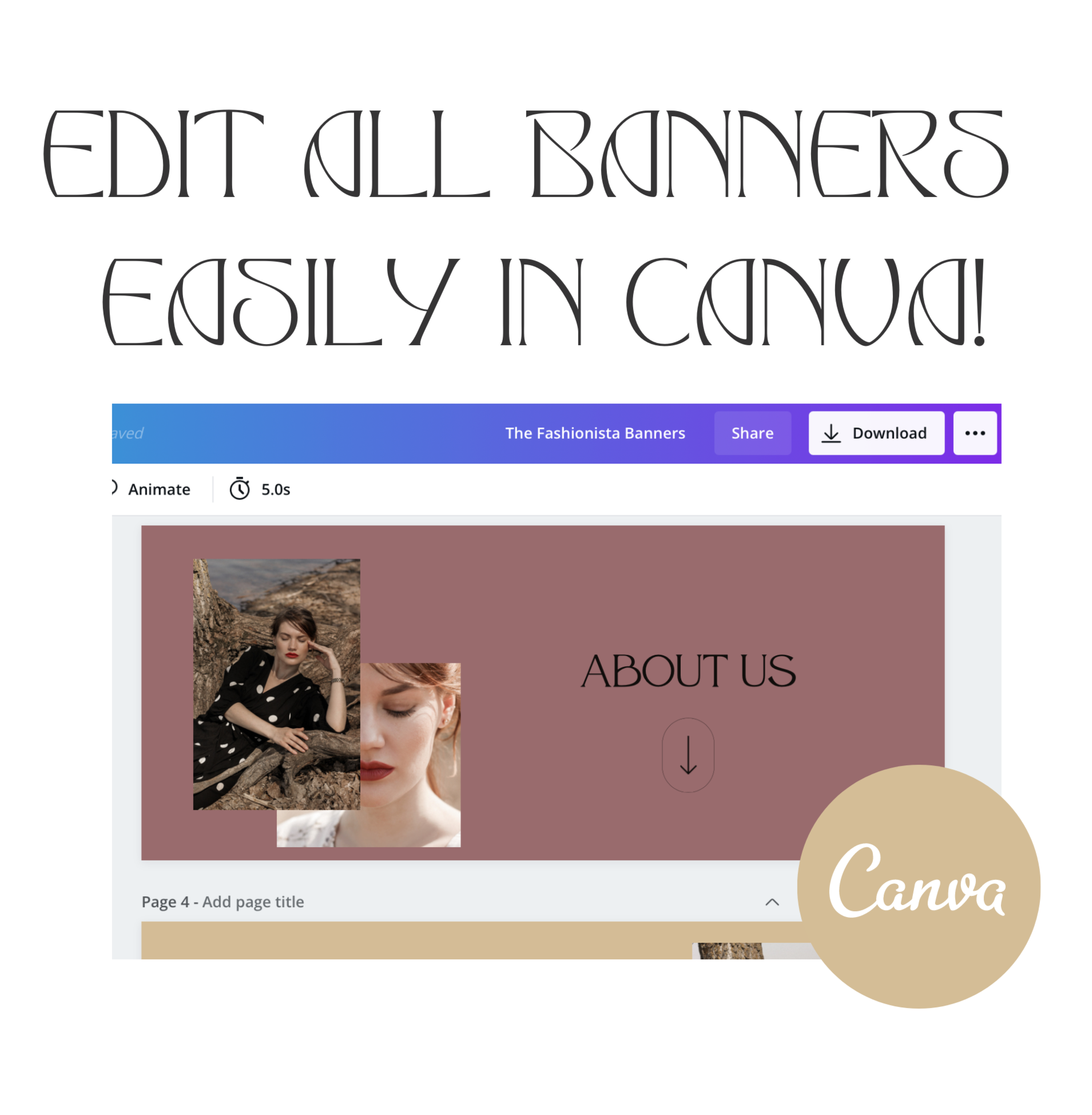 All Shopify store banners can be edited in Canva, and colors + fonts are editable in Shopify's customizer. Use Shopify's button feature or add text to your banners through design. Just swap out the images and colors to match your brand.