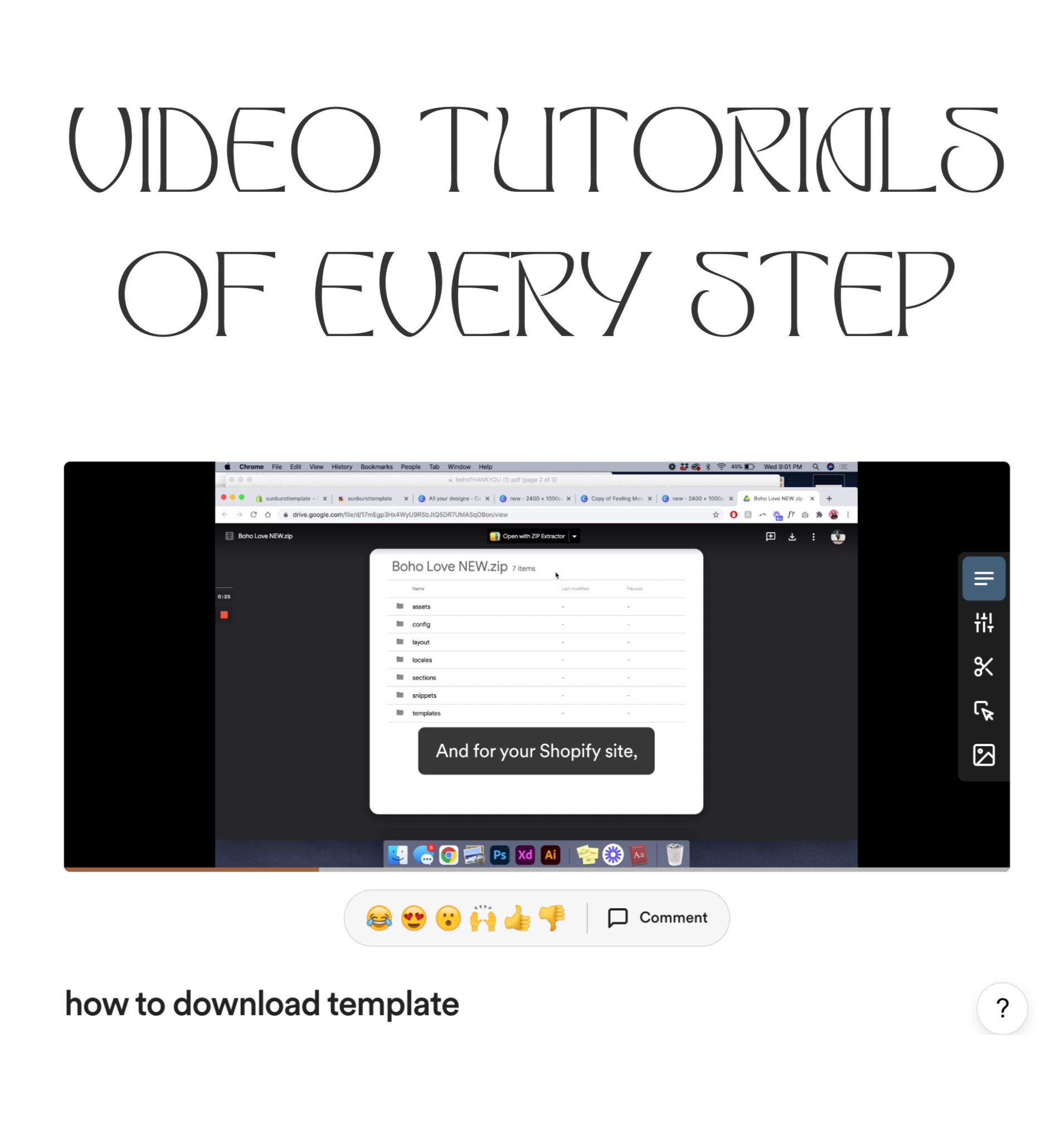 - 1 File (.pdf) with Shopify Theme zip file, Canva templates, and step-by-step video instructions